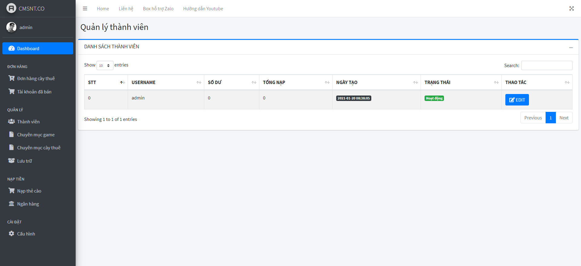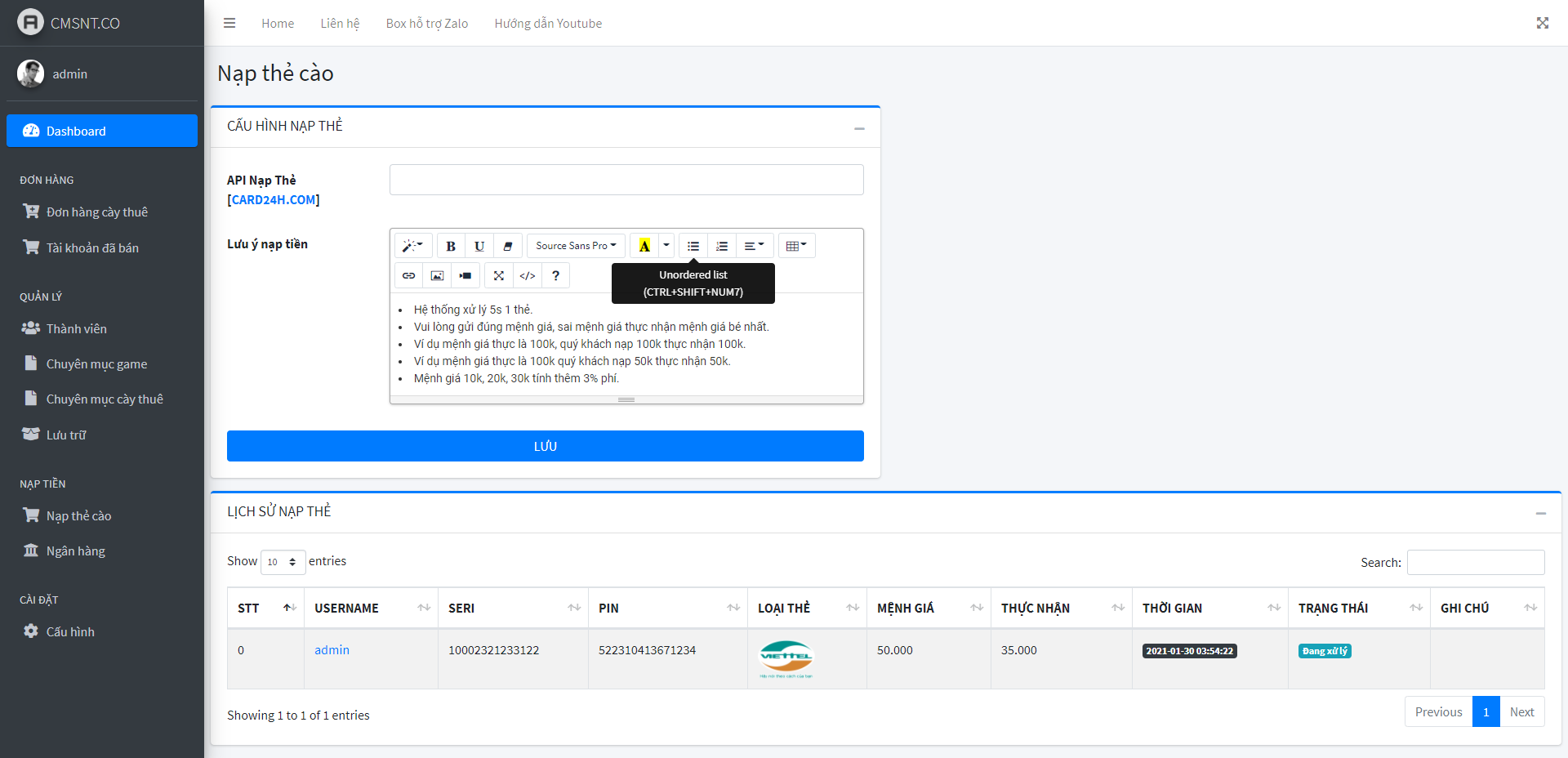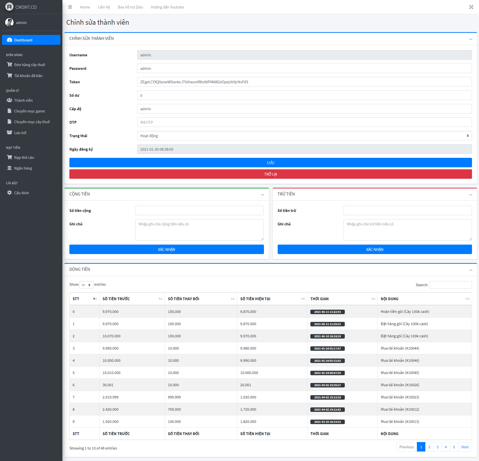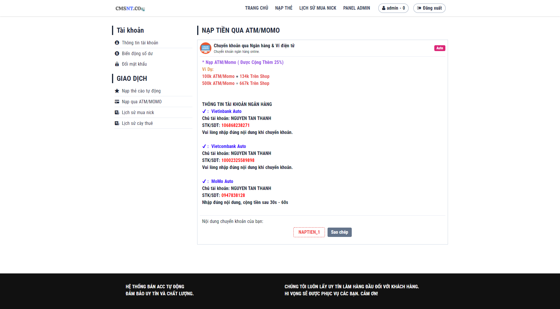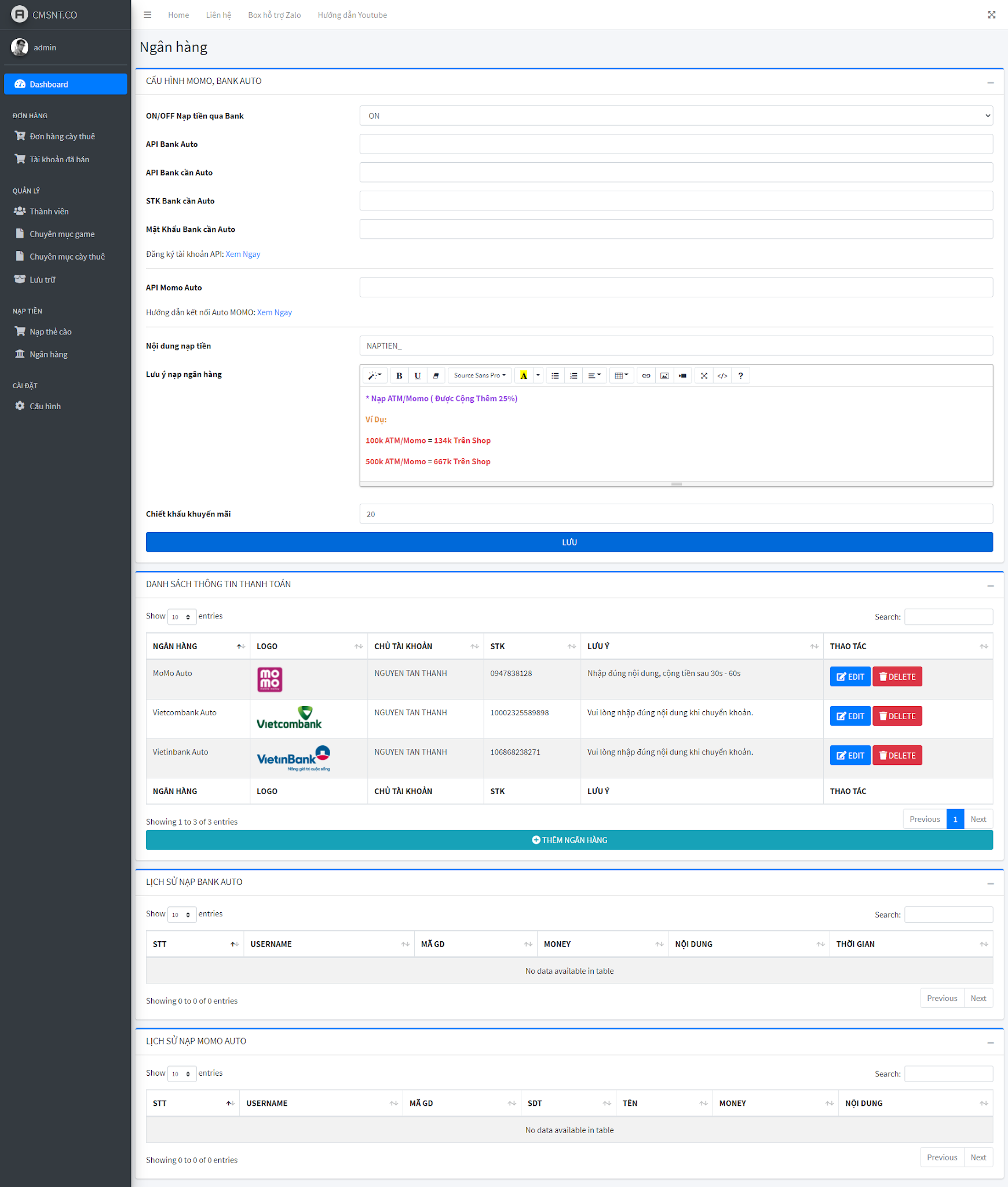 - Nạp tiền tự động cộng tiền cho user qua ngân hàng, ví momo, thẻ cào...